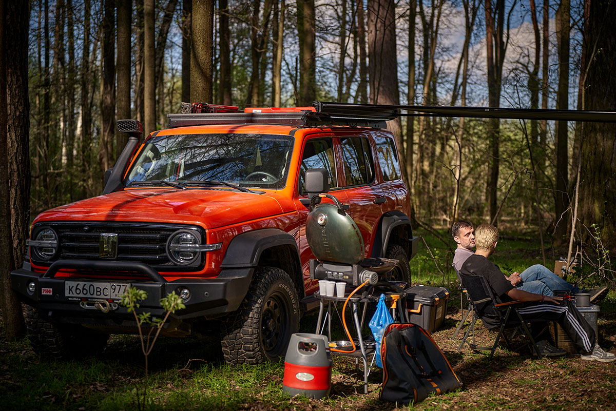 Такой тент позволяет с комфортом разместить рядом с автомобилем трёх-четырёх человек.