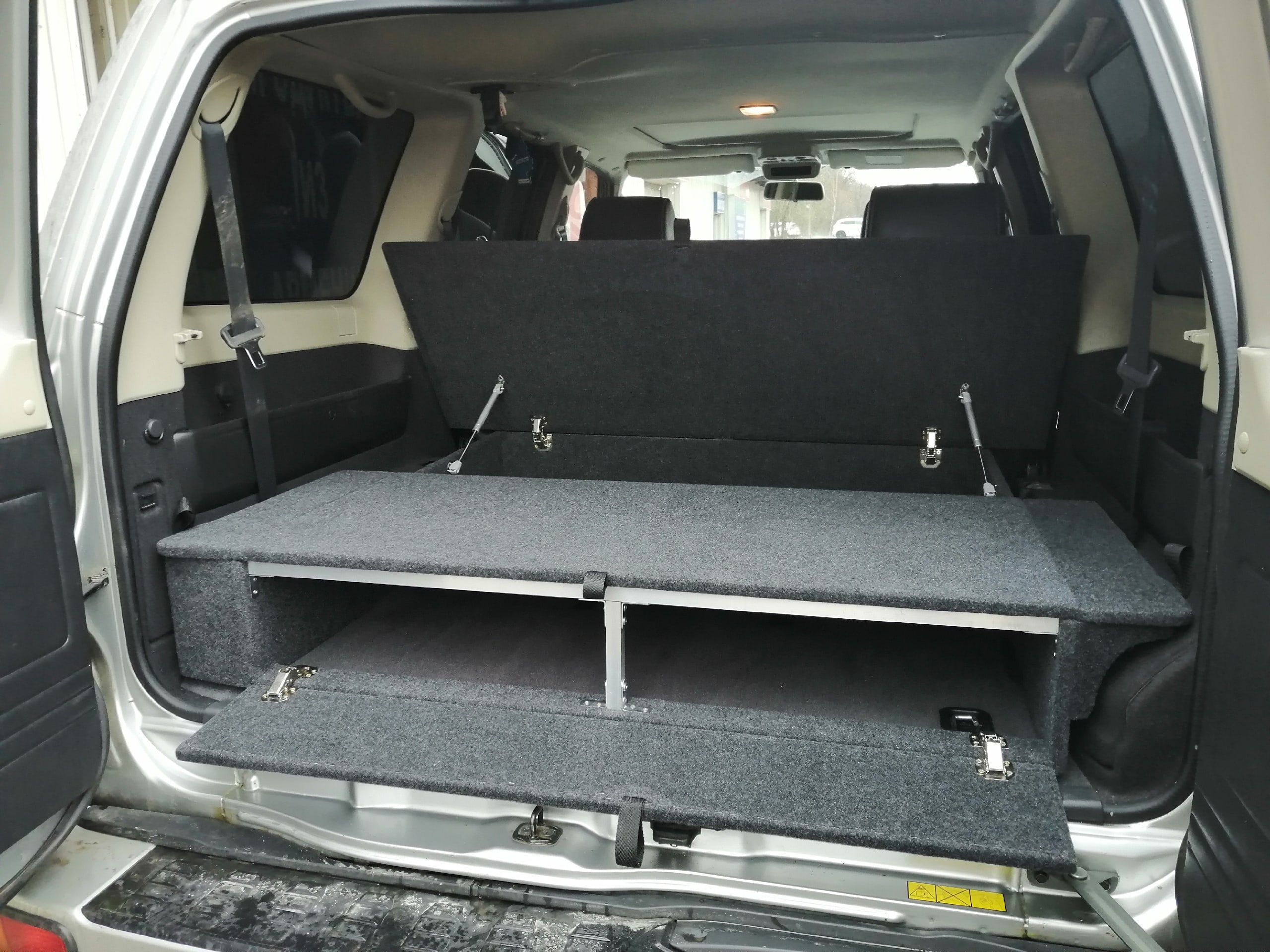 Органайзер-спальник позволяет убрать стропы, огнетушитель, аптечку, компрессор и т.д. в свои просторные ящики. При сложенных спинках задних сидений образует ровный пол, можно обустроить спальное место.